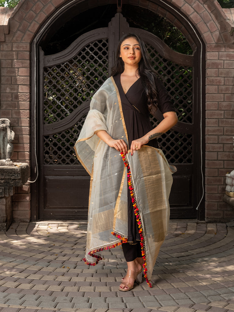 Embrace the beauty of the sheer rich organza dupatta adorned with latkan. This supreme white see-through organza dupatta is a reflection of Gujarat’s origin.