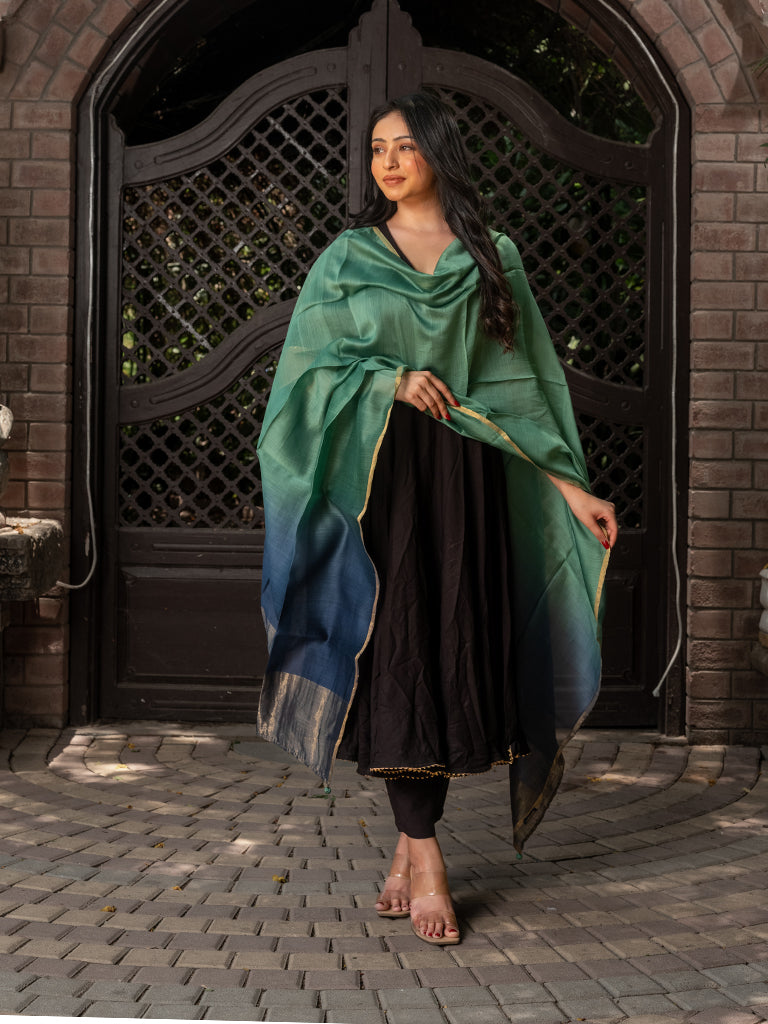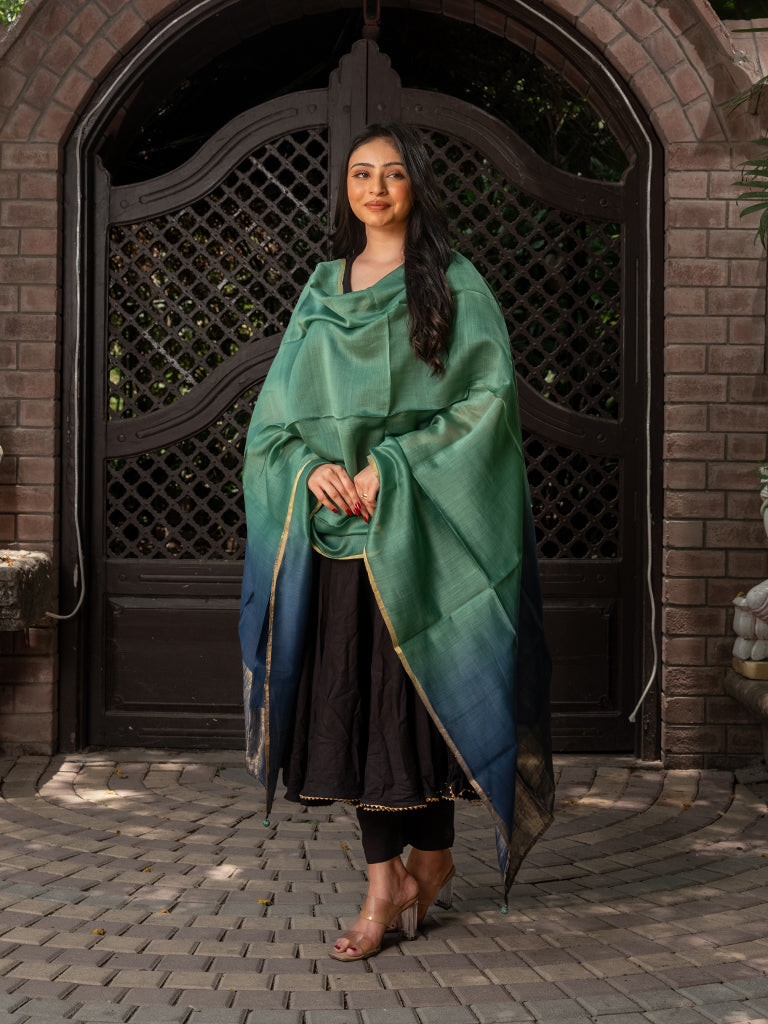 Embrace your style with our stunning ombre dupatta, featuring vibrant shades of green and blue. This tie-dye dupatta is beautifully detailed and adorned with playful tassels, adding to its charm. Discover this beautiful two-tone green and blue ombre dupatta, perfect for all your traditional events.
