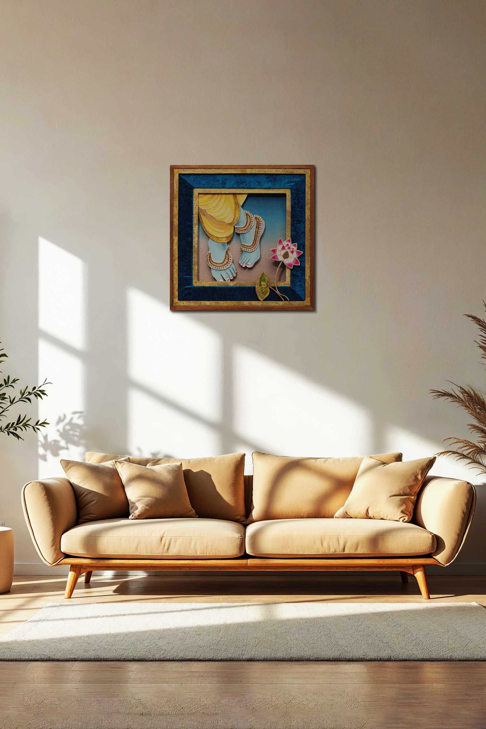 Embodying elegance and divinity, Padkamal is a magnificent hand-painted wall frame crafted by skilled artisans from Ahmedabad. Made on rich gaji fabric, it features intricate khatwork and exquisite gold foil painting, exuding a luxurious charm. The deep royal blue and brown tones lend a regal touch, making it a statement piece for any interior. Every detail is a reflection of devotion, patience, and timeless craftsmanship. Rooted in India’s artistic heritage, this piece celebrates the union of tradition and finesse. Keep away from direct sunlight and clean gently using a blower to preserve its beauty. Handcrafted with love, Padkamal brings sacred artistry to your home.