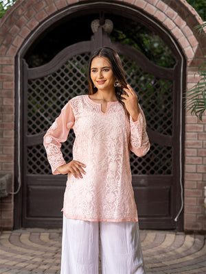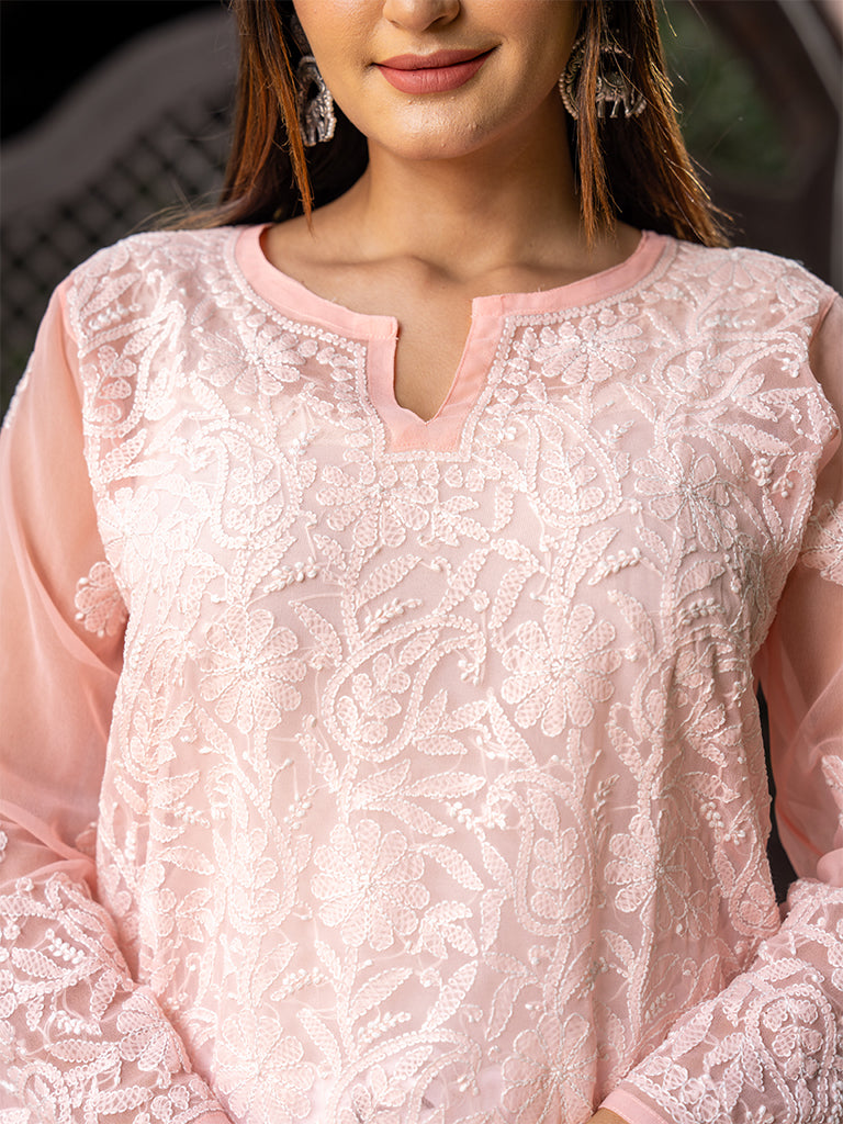 Add a touch of gorgeousness with our peach floral kurta in your fashion ensemble. This georgette chikankari kurta has minute embroideries of floral designs. Embrace its beauty and style it with your favourites jumkhas.