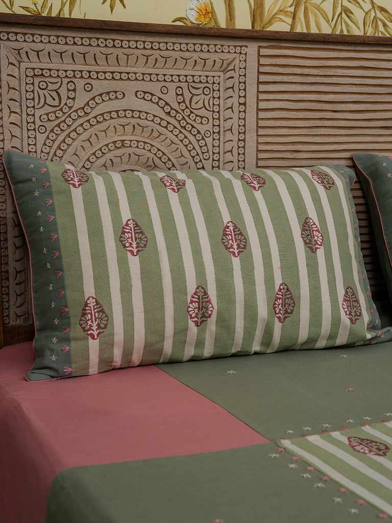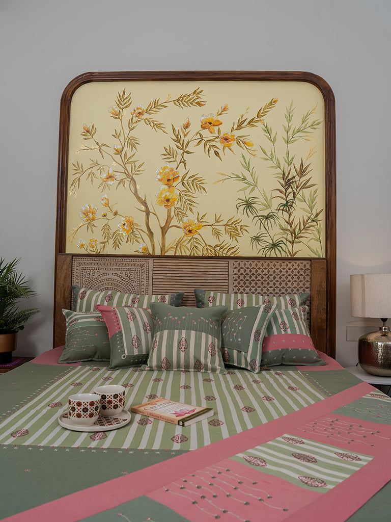 Elevate your room with the peach mint dazy floral bedsheet set with an amazing handwork detailing. The subtle combination of pink and green has the quality of a soothing feel to relax. Embrace the finest quality of cotton used to enhance comfort while you sleep. It is perfectly designed for your bed size. The block-printed bedsheet comes along with the set of pillow covers. The minute intricacies of handwork and block print belong to the region of Gujarat and Rajasthan. Handmade with love and devotion by our artisans.