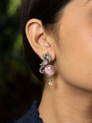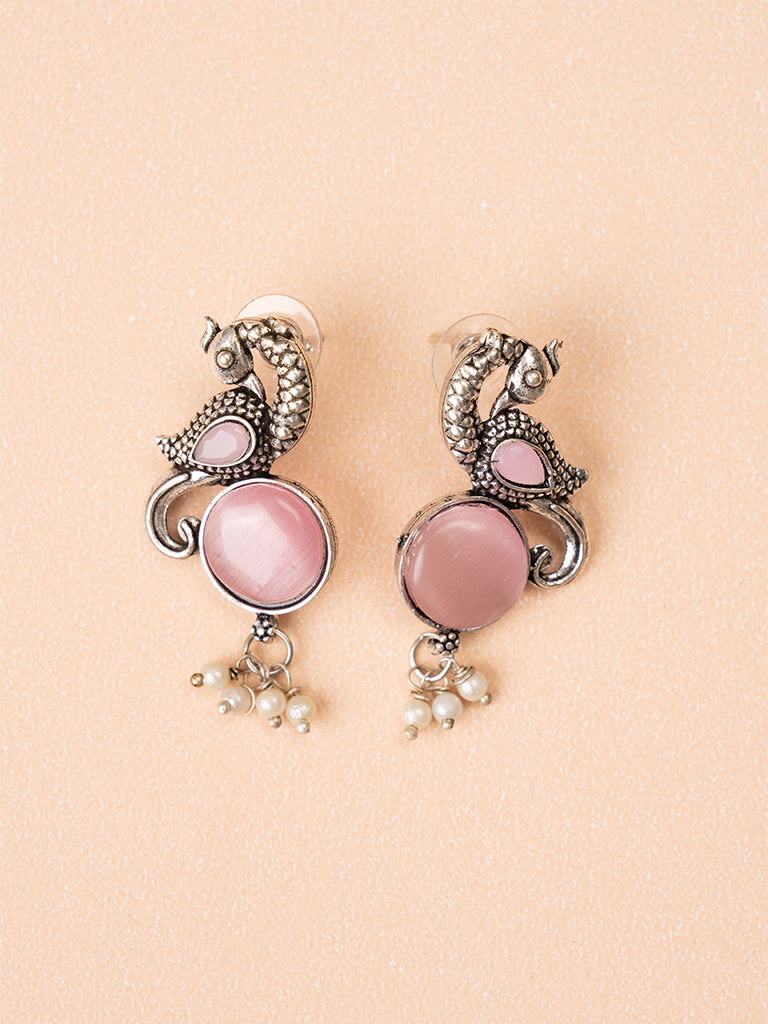 Uplift your fashion styling with the silver peacock pink oxidised earring in German silver. It originated in Jaipur, Rajasthan. The metal casting is done with attention to detail by our artisans.
