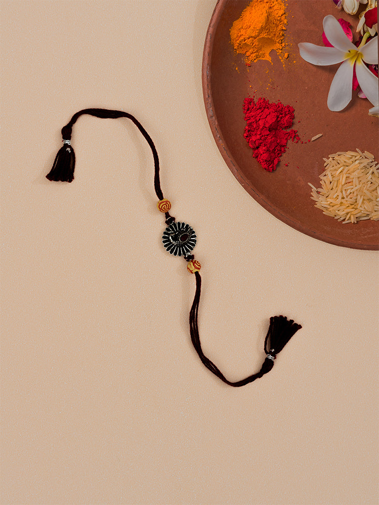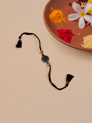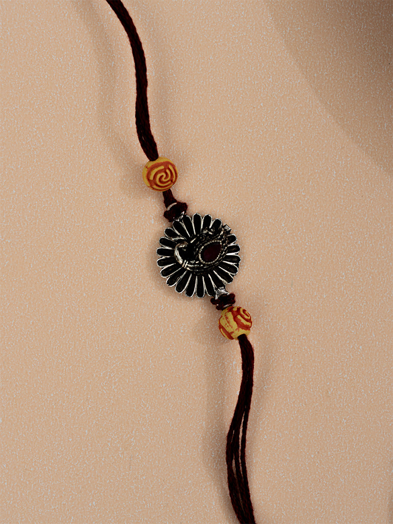Embrace the exquisite peacock ruby stone oxidised metal rakhi. This handmade traditional Rakhi is designed for your loved brothers. Made with utmost finesse and good faith by our artisans.