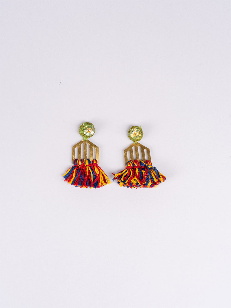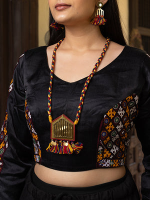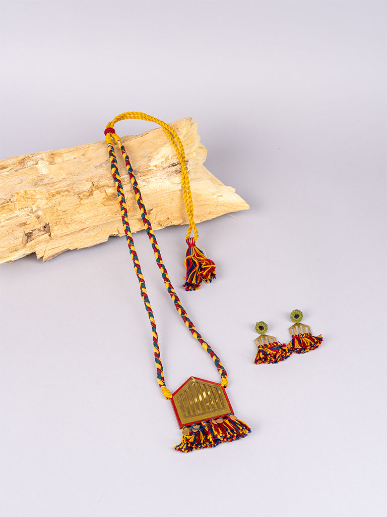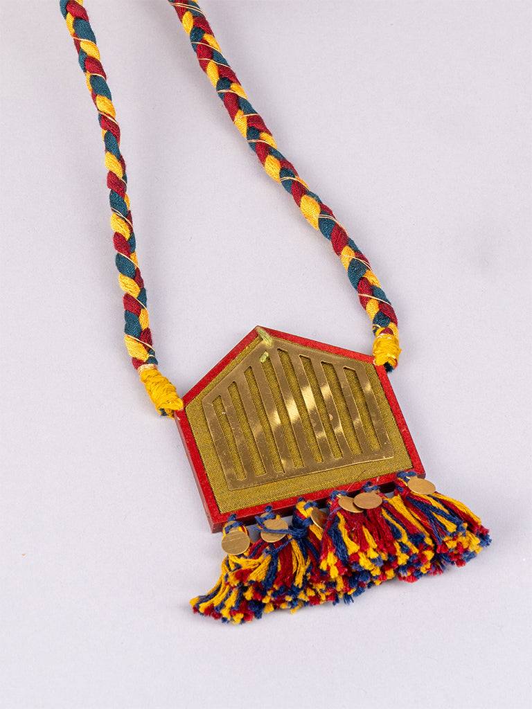 Looking for a contemporary piece of necklace to style at your most-awaited soiree? Explore the craftsmanship of our artisans using superior-quality brass to create shapes. The look is enhanced with rich cotton threads used to create a subtle modest look. Yes, Fabric is placed on the MDF block. A perfect piece to gift your favourites. The beautiful multi-coloured necklace with earrings is truly for all occasions.