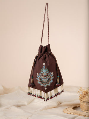 An amazing pentagonal potli with sujni hanging is an indication of intricate craftsmanship festooned with zari embroidery. Embrace the royal potli epitomizing the identity of Gujarat. This is a handmade gorgeous potli made by our artisans with attention to detail.