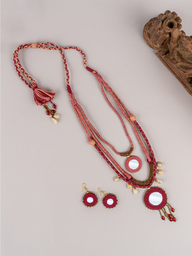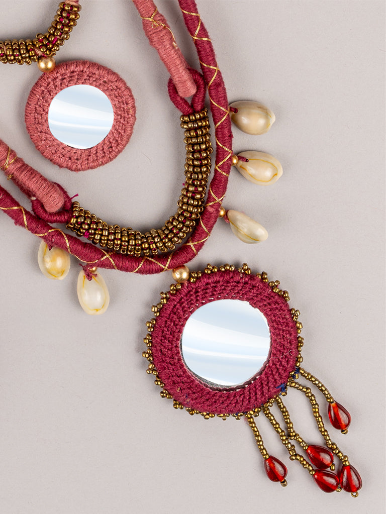 The pink layered necklace set is an epitome of Indian craftsmanship. Admire the pink neckpiece handmade with supreme quality cotton threads and beads. Embrace the layered neckpiece crafted with a contemporary mix of shells to elevate the look. It is an alluring symphony of handwork done by our skilled artisans. A perfect piece to add