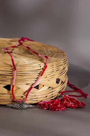 Brighten up your style with this charming Pink Madaliyu Pendant, a beautiful blend of traditional craftsmanship and contemporary design. Carefully handcrafted using metal, thread, and cord, it features intricate metal detailing and delicate handwork, making each piece unique and artisanal.