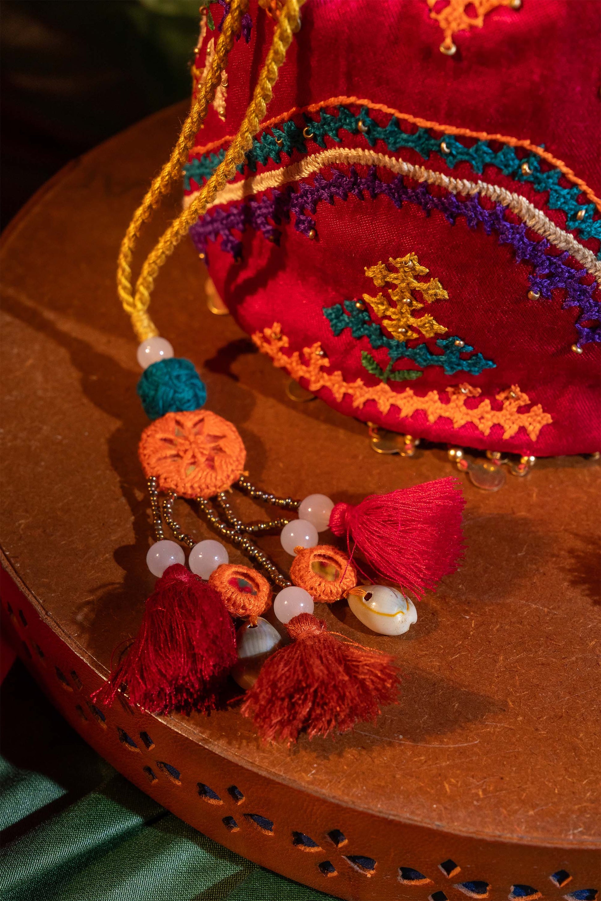 Crafted using premium Gaji fabric, it is adorned with shells, mirrors, beads, colourful threads, brass tikkis —each element meticulously placed to reflect the essence of authentic Rabari work. The rhythmic wave pattern on the potli brings movement and soul to the design, making it not just an accessory but a statement piece.