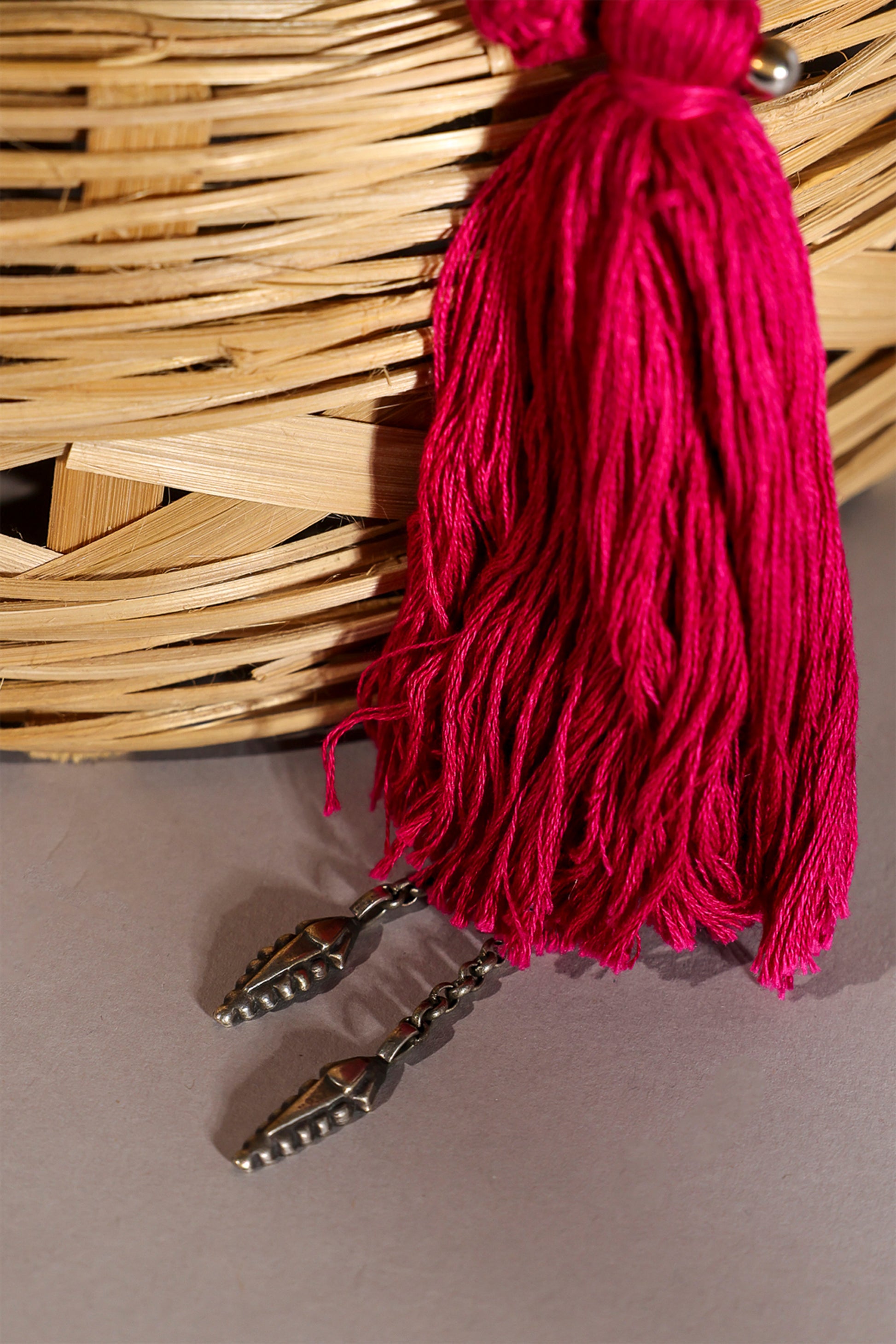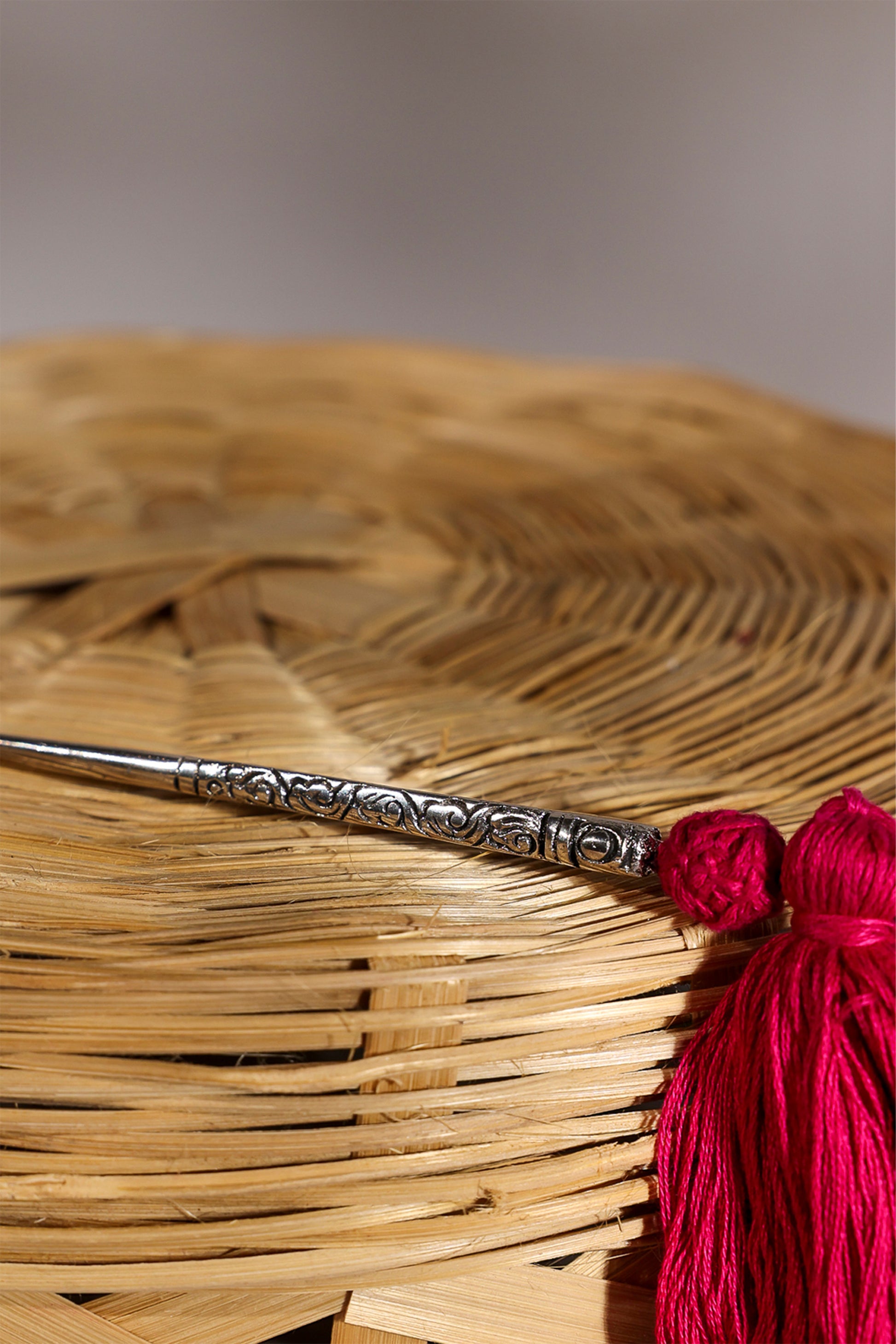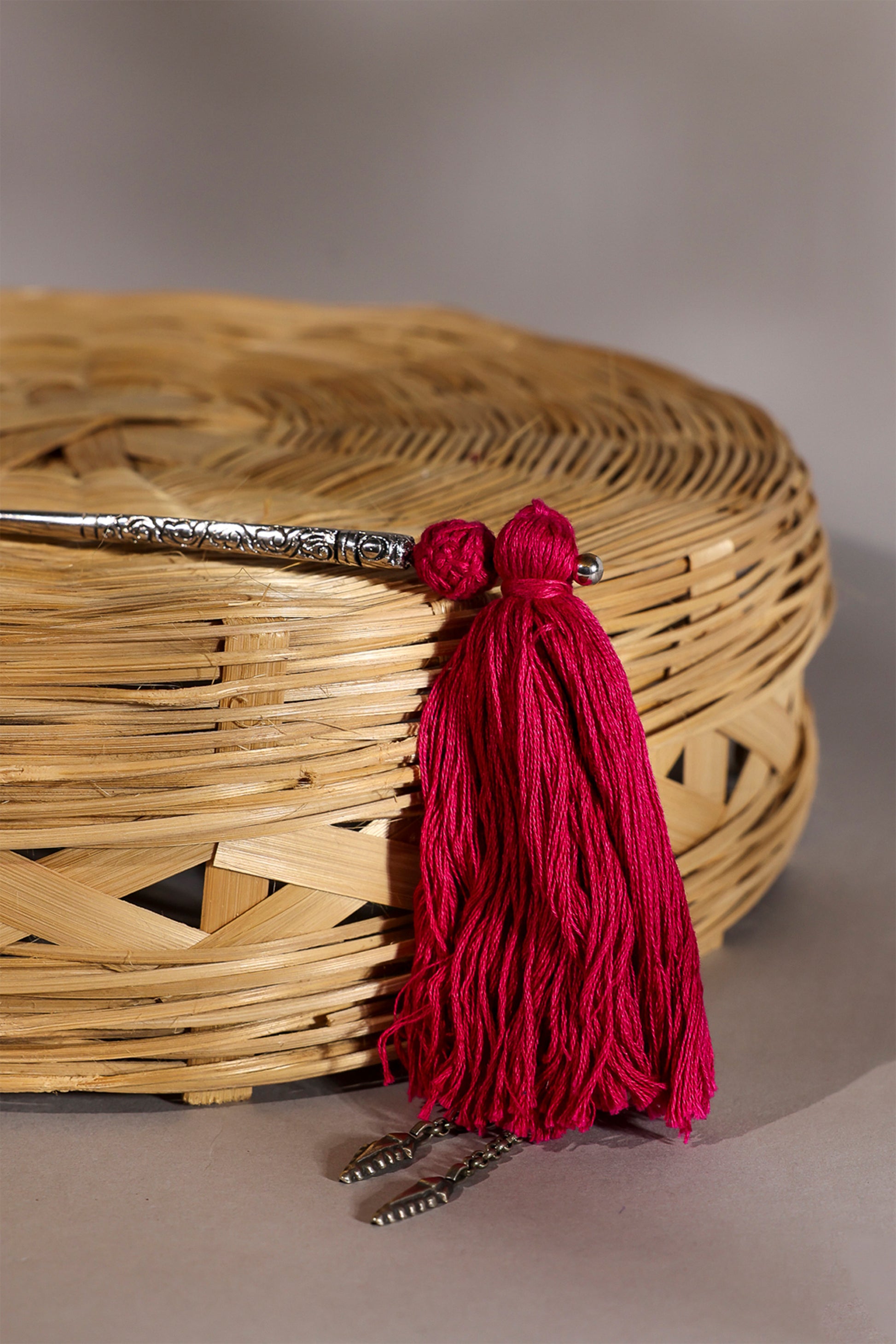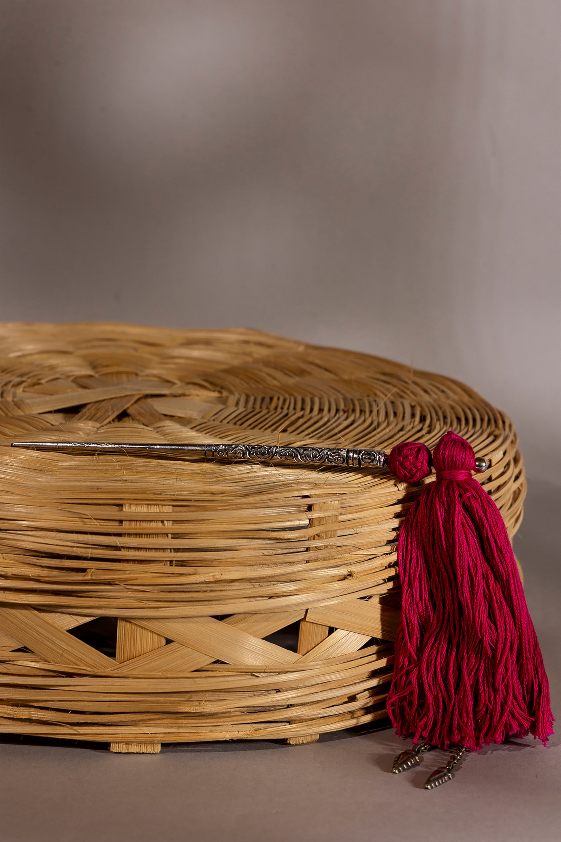 Add a touch of elegance to your hairstyle with this handcrafted hair stick. Made with fine metal handwork and detailed with delicate chord and thread work, it features charming pink tassels that bring a playful yet graceful finish. Lightweight and versatile, this accessory blends traditional craftsmanship with contemporary style, making it perfect for festive looks or everyday chic styling.