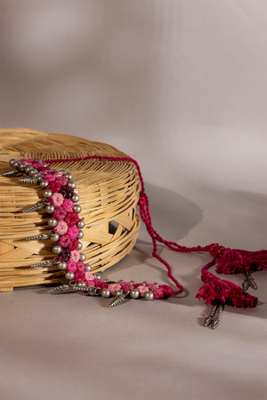 Elegant and handcrafted, this pink thread ball leaf choker is a celebration of artistry and tradition. Designed with a sturdy metal base, it features intricate handwork woven with fine thread and cord. The delicate leaf motifs paired with vibrant pink thread balls add a touch of nature-inspired charm. Lightweight yet striking, it rests gracefully on the neckline, making it ideal for festive occasions or statement styling. Versatile enough to complement both ethnic and fusion outfits, this choker is perfect for those who value unique handmade creations. A timeless piece that brings together craft, culture, and contemporary elegance.