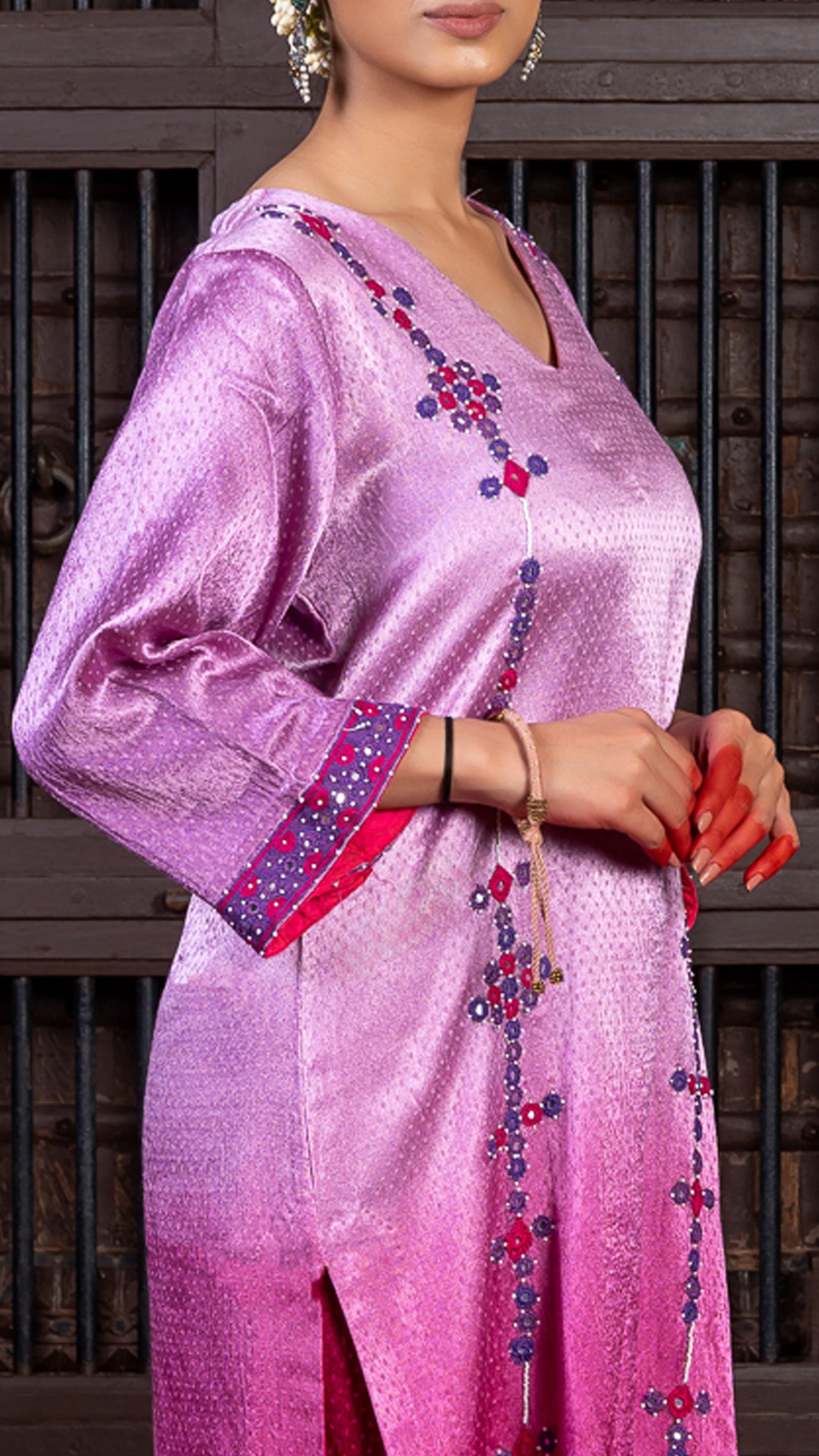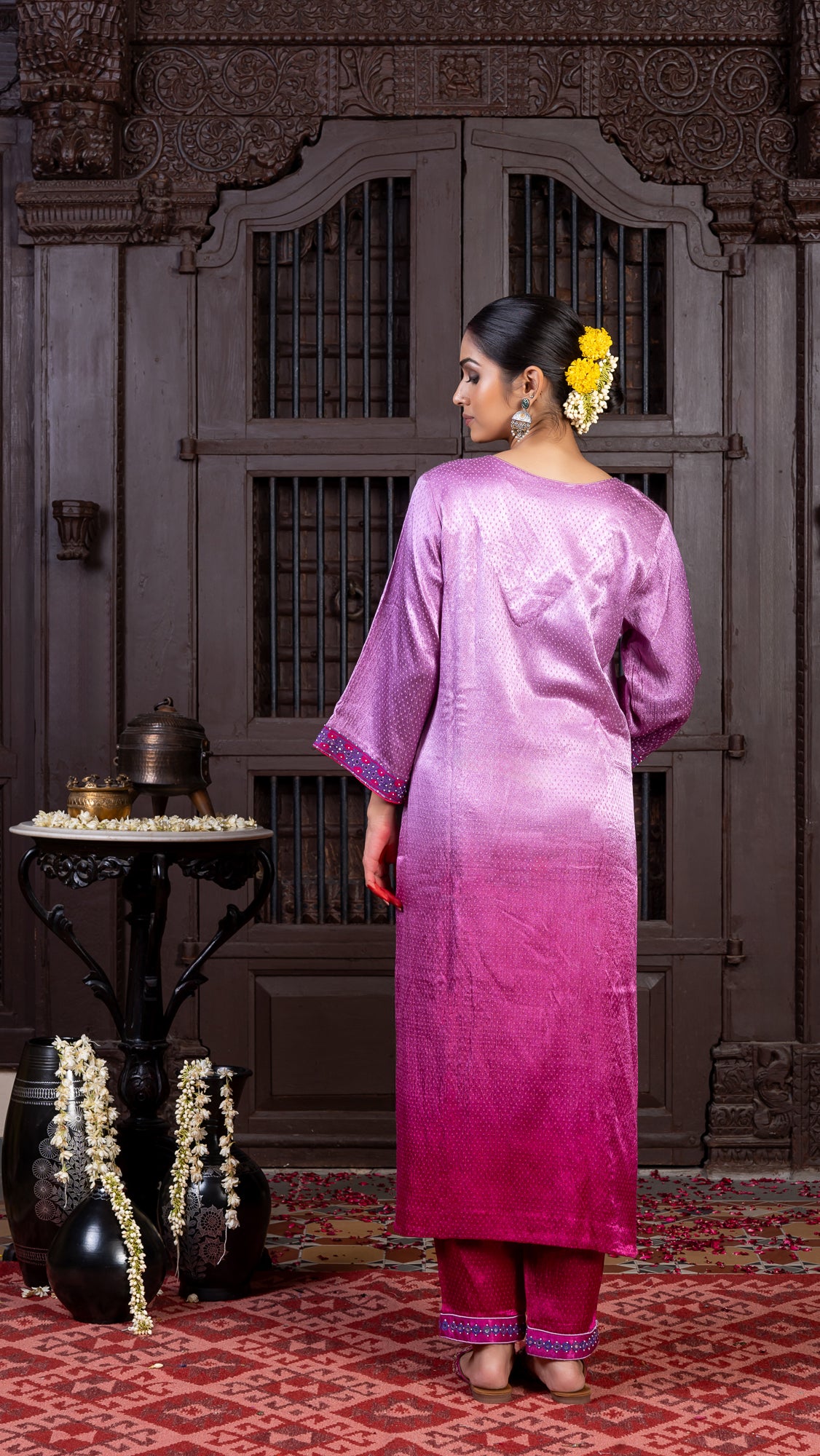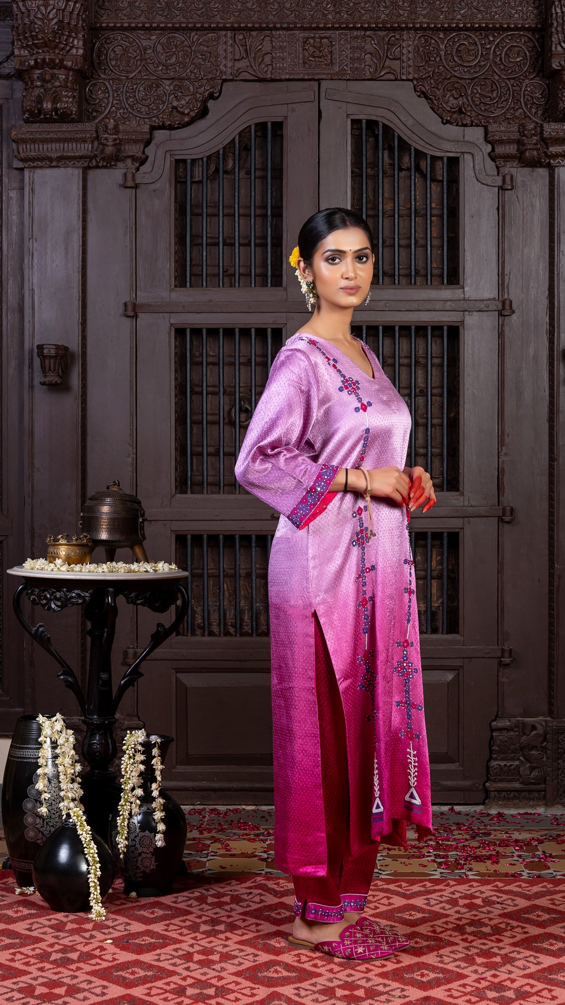 Pink to Violet Mashru Kurta Set with Mirror-Embellished Rabari Work