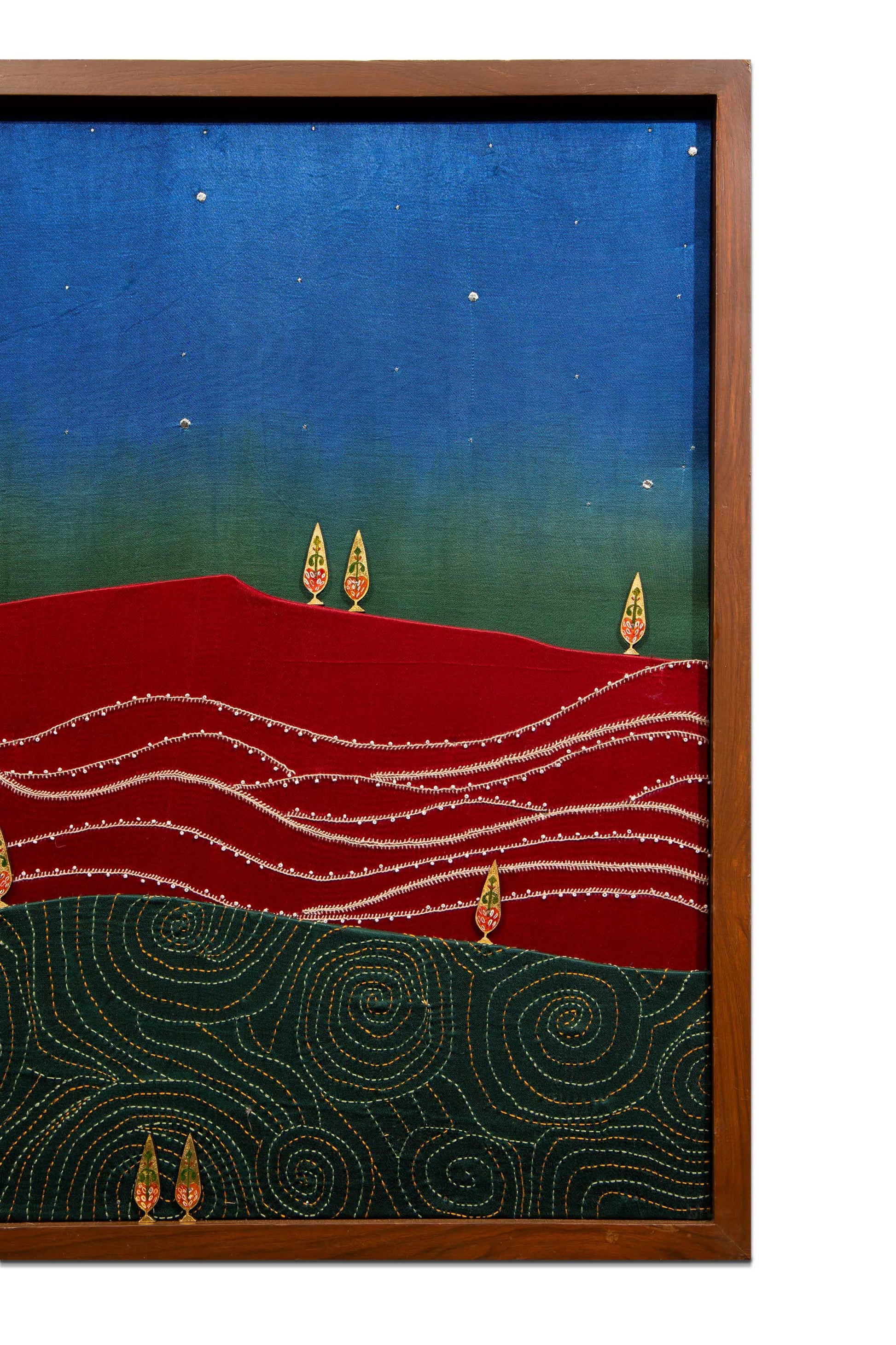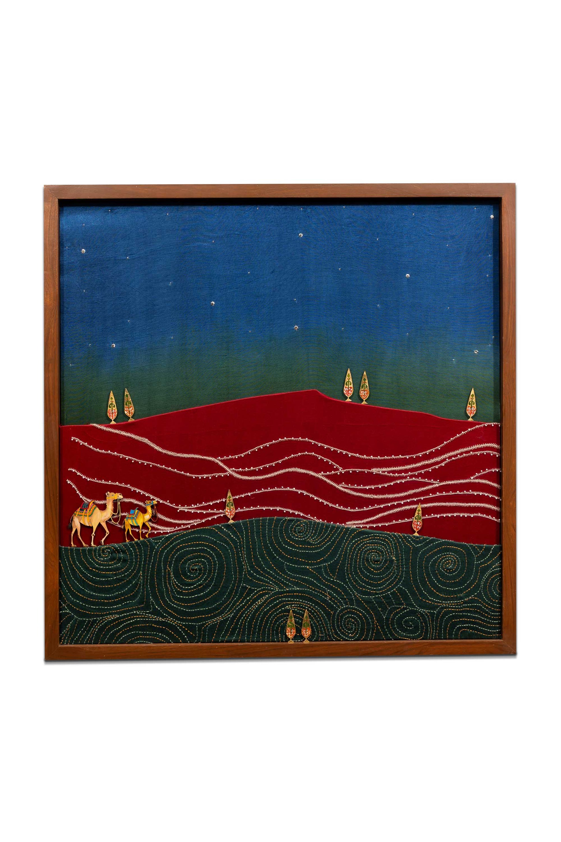 Evoking the spirit of Gujarat’s vibrant landscapes, Rann Safar is a masterpiece that captures the soul of traditional artistry. Handcrafted by skilled artisans from Ahmedabad, this elegant wall frame is rendered on rich gaji silk, combining fine painting with intricate embroidery for a regal finish. The serene blend of blue and green hues reflects harmony, nature, and cultural richness. Every detail speaks of dedication, craftsmanship, and the timeless beauty of handmade art. Perfect for adding sophistication and character to your interiors, it celebrates India’s textile heritage in its purest form. Avoid direct sunlight and clean gently using a blower. Rann Safar — a journey through art, culture, and craftsmanship.
