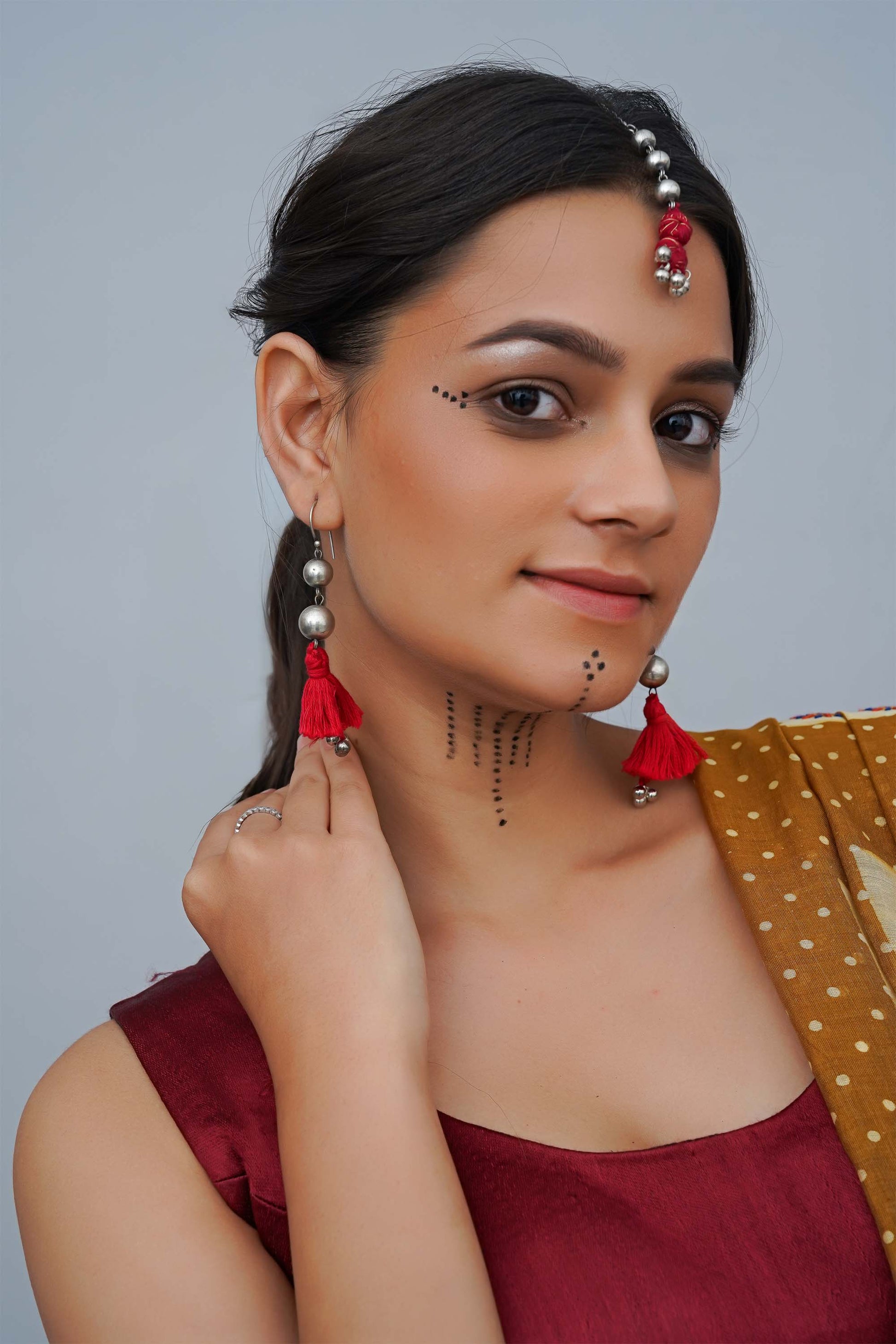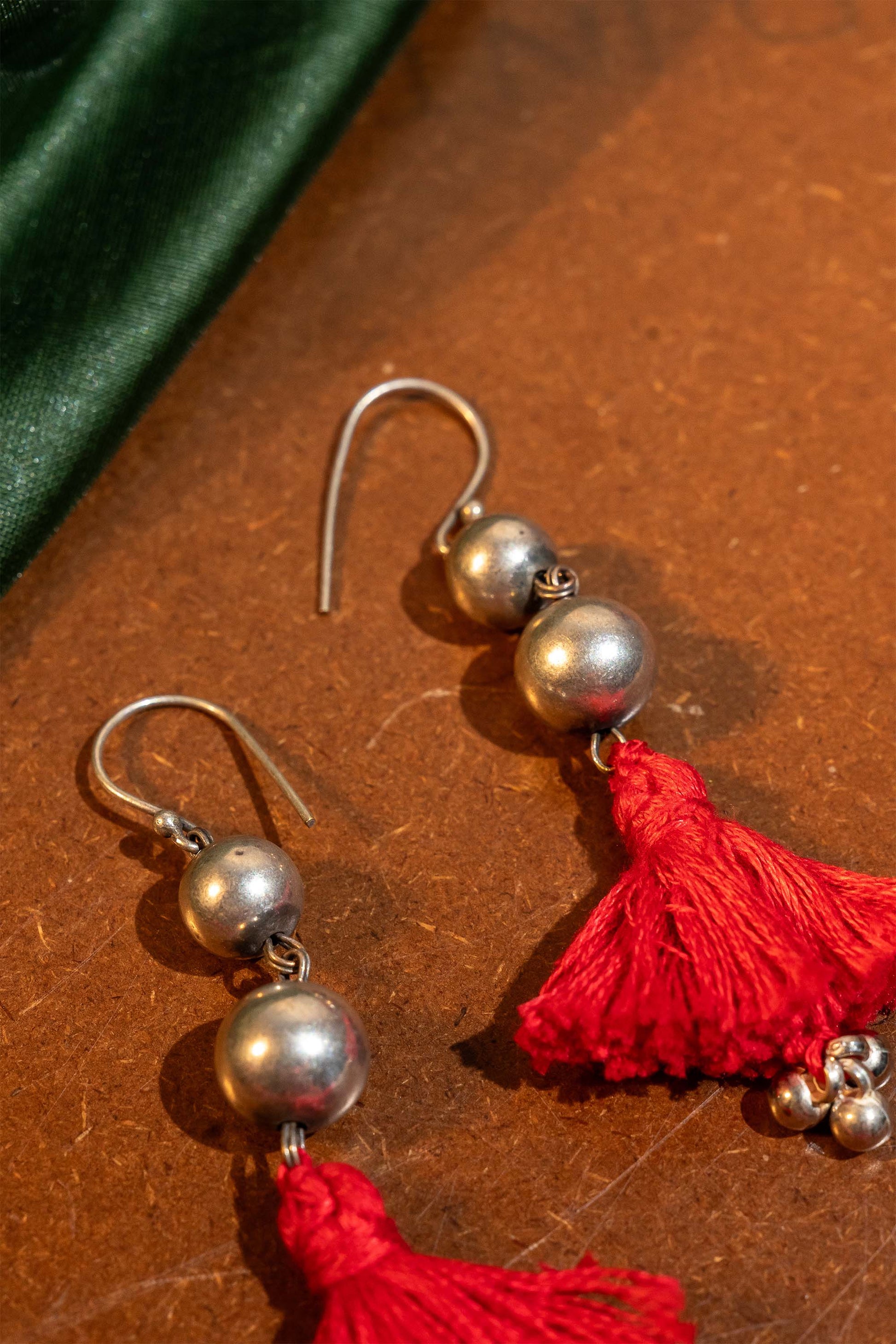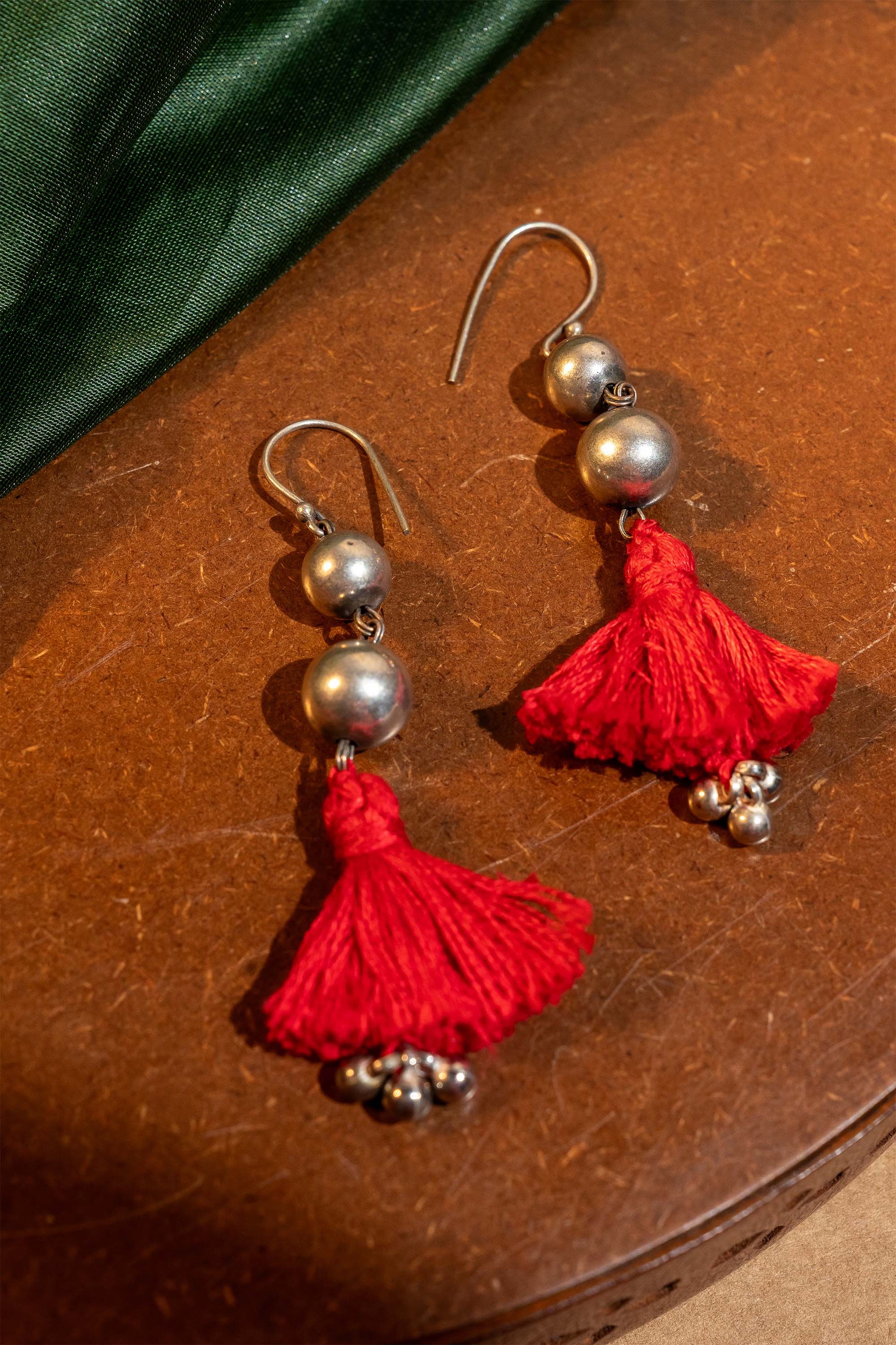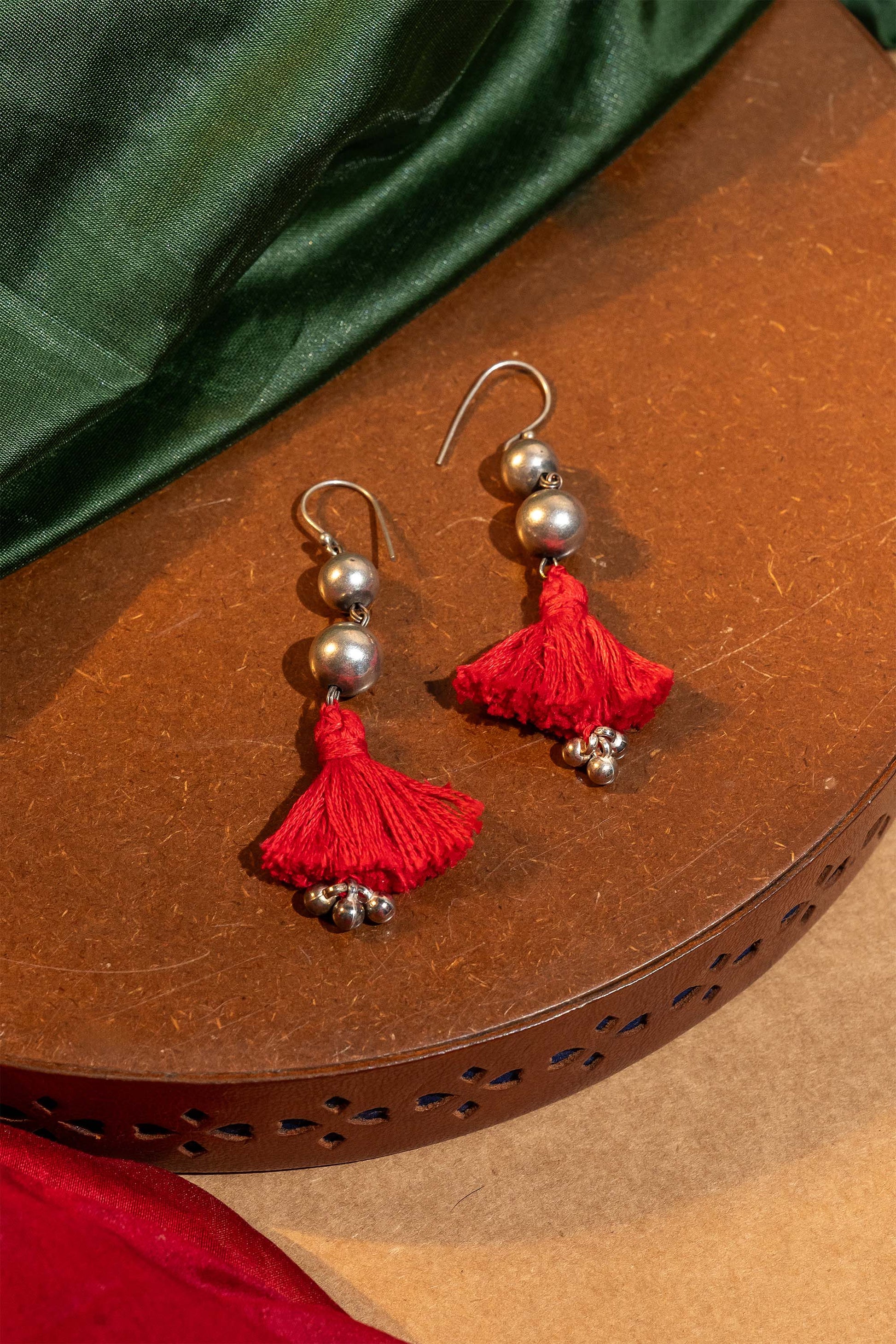 Brighten up your festive look with the Red Oxidised Ball Tassel Earrings from Craftroots’ Navratri collection. Handcrafted with intricate metalwork and detailed hand embroidery, this striking pair reflects the skill and artistry of Indian artisans. Designed with vibrant cotton thread tassels and bold oxidised metal balls, it creates a perfect blend of tradition and contemporary style. The use of soft cotton threads and sturdy cord ensures both elegance and durability, making it ideal for long festive celebrations. Lightweight and easy to wear, these earrings add movement, color, and charm to any ethnic or fusion outfit. Celebrate Navratri with jewelry that carries the beauty of handmade craftsmanship and timeless design.