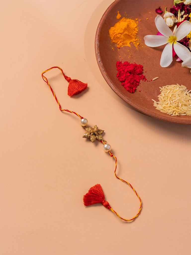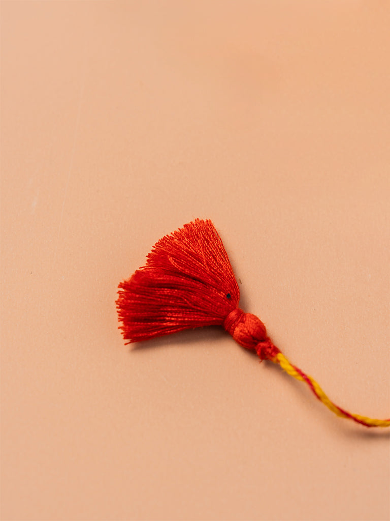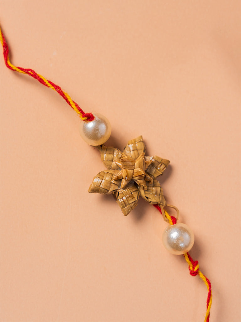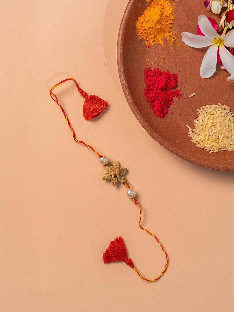 Create your sweet moments with your brother with our exquisite star bamboo Rakhi. This yellow-orange Rakhi is designed with attention to detail by our artisans. To enhance its appearance there are white pearls and tassels at both the ends.