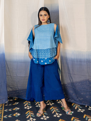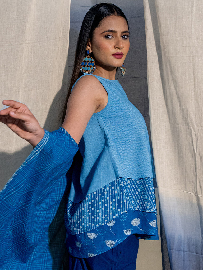 Admire the three-layered top mixed with the different block print layers to enhance its appearance. This top is blue and made out of supreme soft cotton fabric which adds an comforting feel.