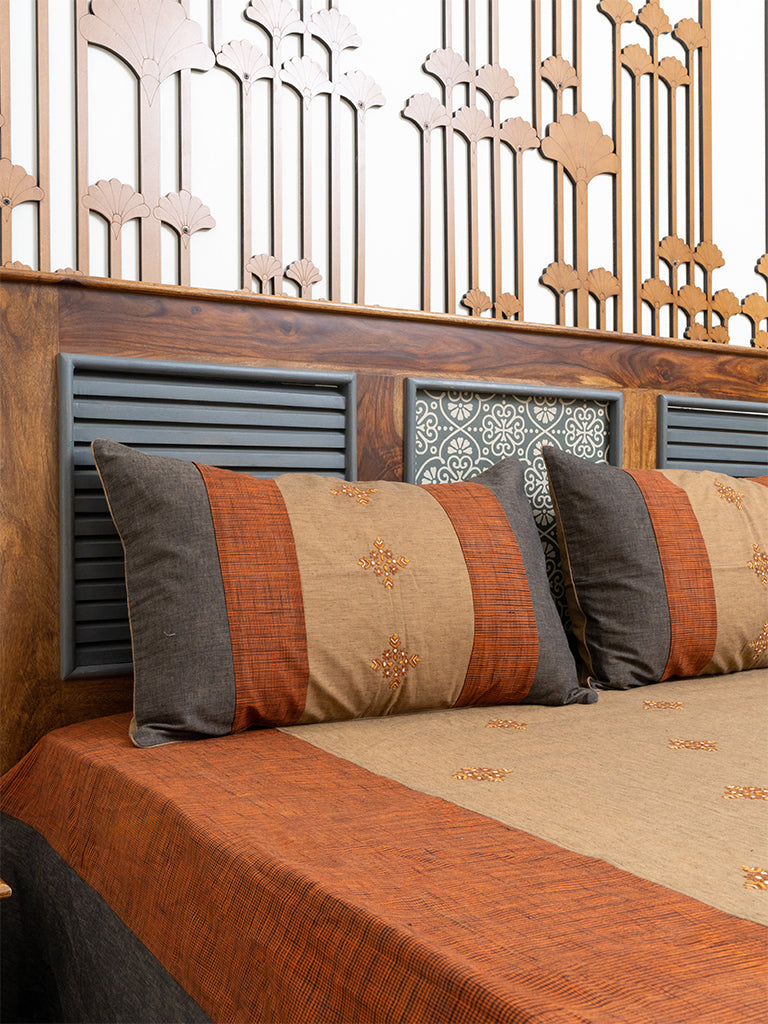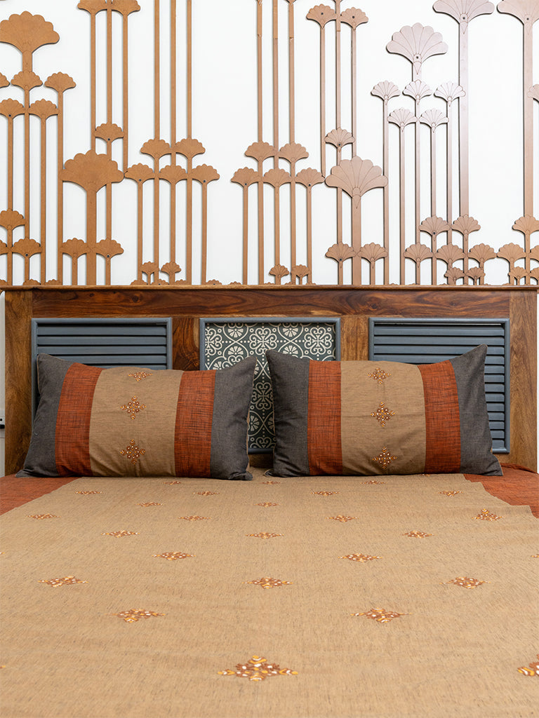 Unleashing the beautiful rust shades of bedsheet with pillow covers adorned with intricate aari hand embroidery. Rich south cotton fabric is used to make. This is a fascinating comfortable bedsheet set for your home.