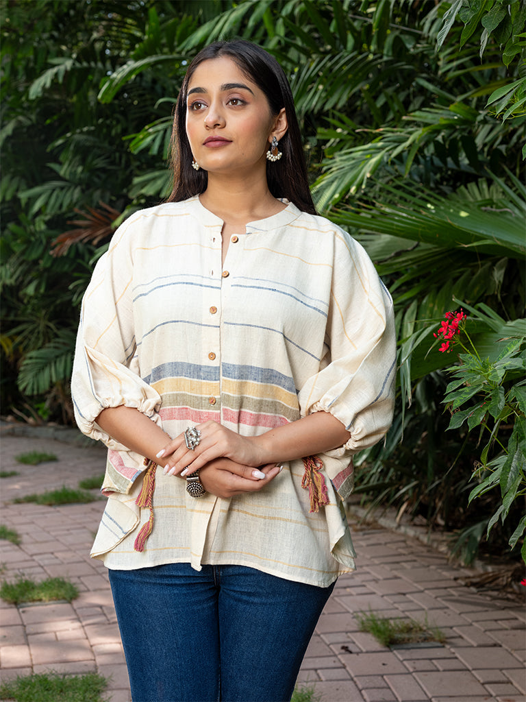 Embrace the sophistication of our Kala cotton short kaftan top for your daily ensemble. Beautifully embellished with hand embroidery, this lovely multi-colour top is a perfect addition to your regular wardrobe collection.