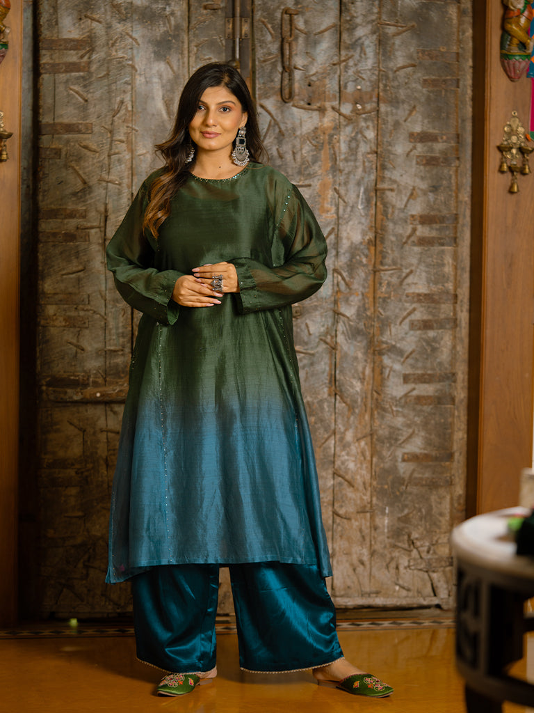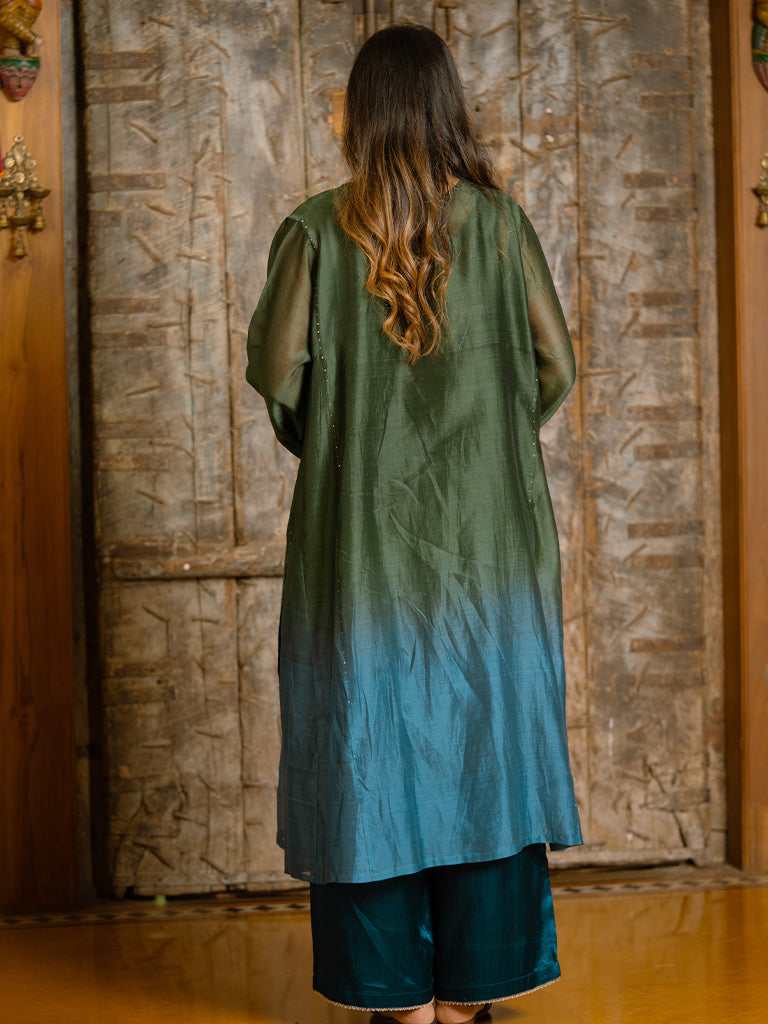 Immerse yourself in the splendid beauty of a green & teal kurta embellished with intricate badla handwork. Made from luxurious chanderi silk, they offer a gentle feel against your skin. Enhance your special occasions with these stunning gradient festive kurtas.