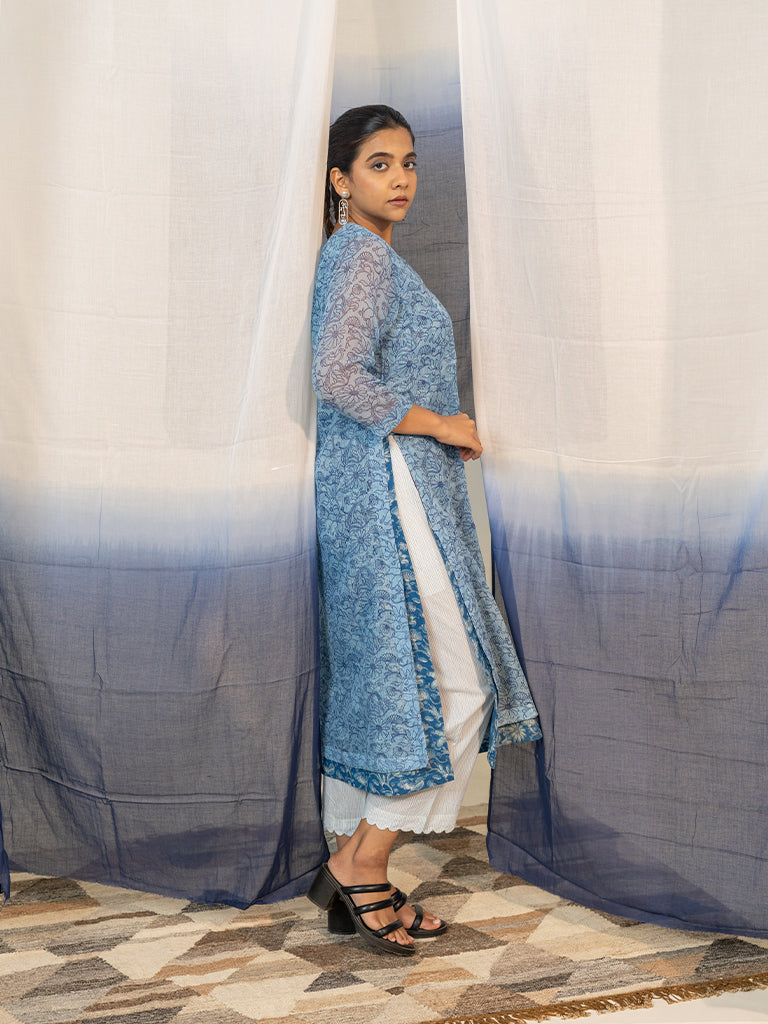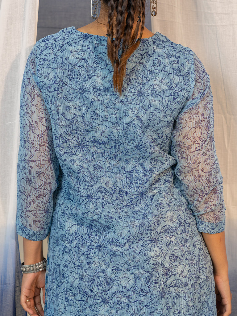 Enhance your fashion game with the rich block print kurta made out of Kota Doria. Carry this charming blue kurta to uplift your casual look.