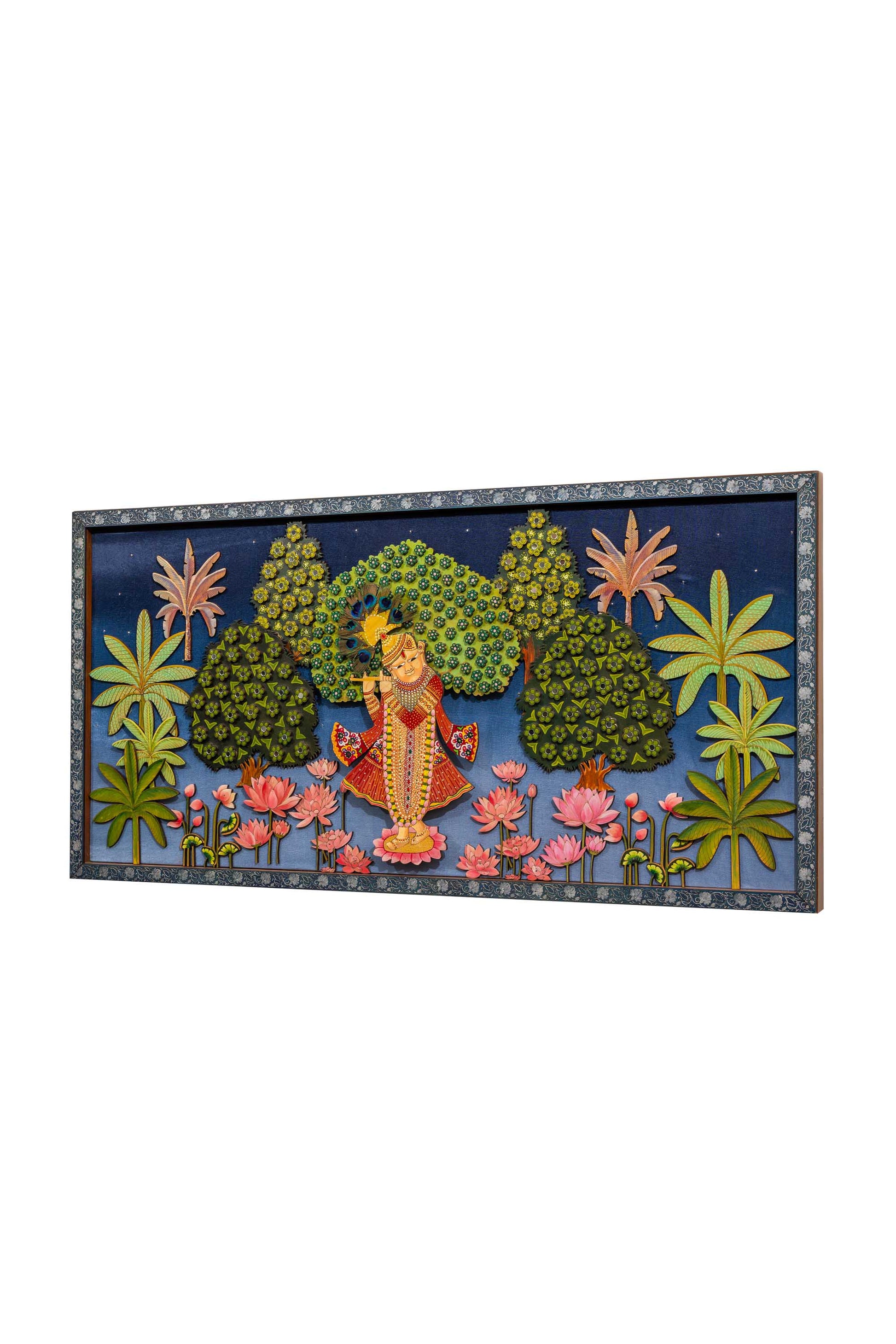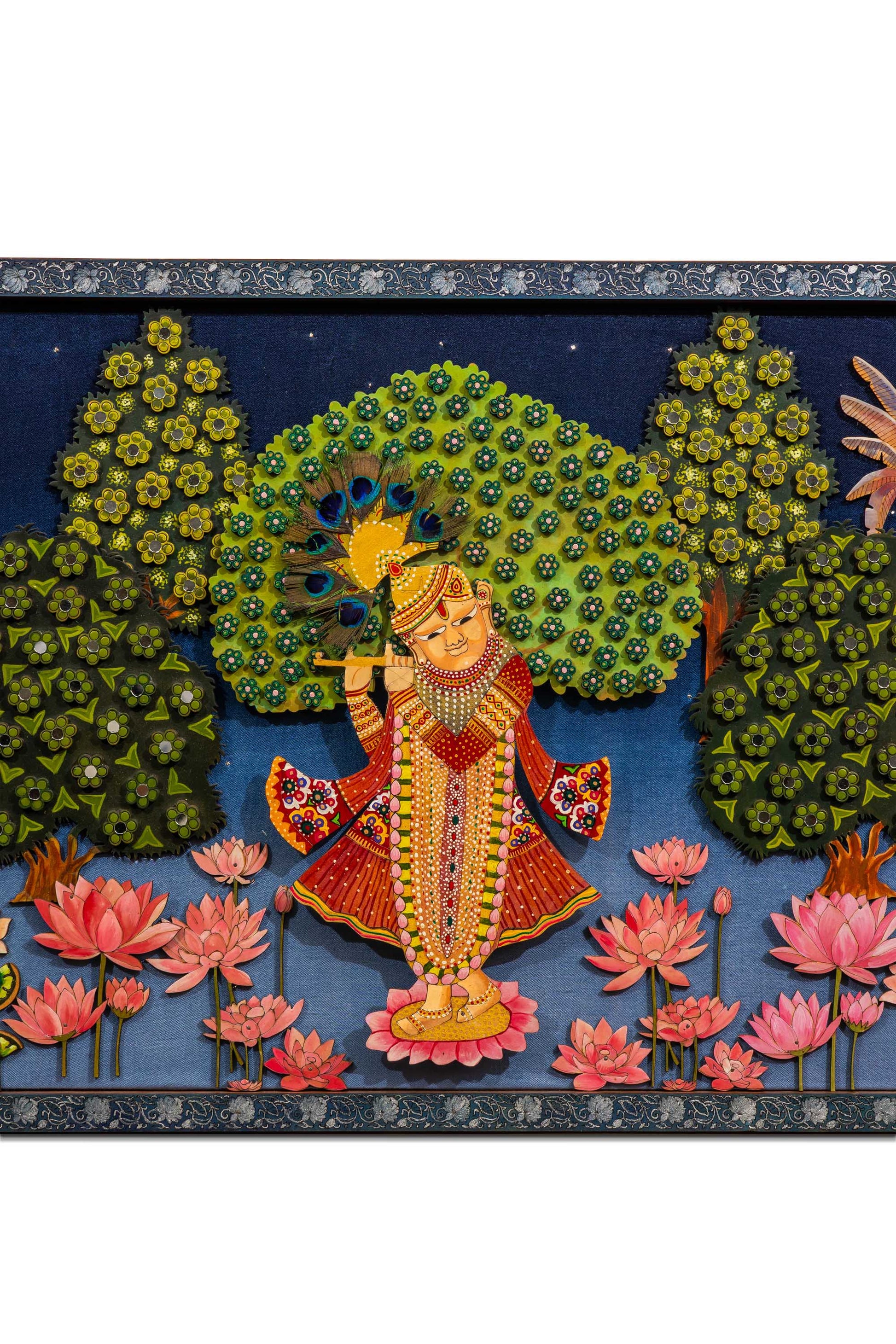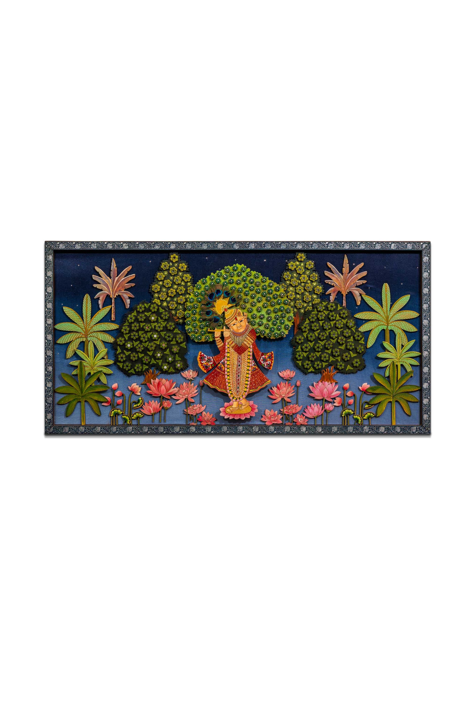 Experience divine artistry with the Vanvihar Bal Shrinath Ji Wall Frame — a captivating blend of tradition and elegance. Hand-painted with intricate gaji and badla detailing, this masterpiece radiates devotion and luxury in soothing shades of blue. Each stroke and embellishment reflects meticulous craftsmanship and cultural richness. Enhanced with delicate feather accents, it adds a serene charm to your space. Ideal for elegant interiors, this artwork should be kept away from direct sunlight and gently cleaned with a blower to preserve its beauty. A perfect statement of art and devotion from Craftroots.