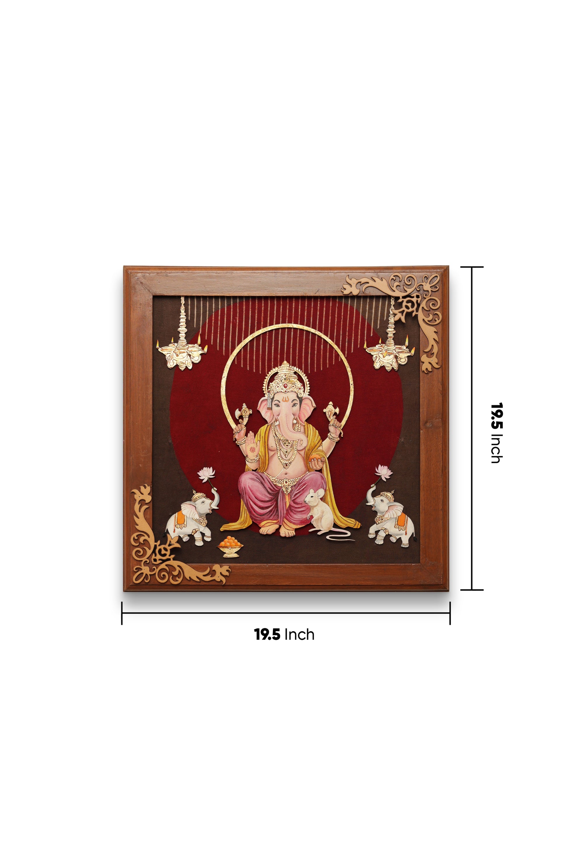 Invoke divine blessings with this Vighnaharta wall frame, a graceful depiction of Lord Ganesh crafted on luxurious gaji silk. Adorned in red and gray hues, the artwork radiates elegance and serenity. Intricate gold foil painting adds a luminous charm, highlighting the fine details of traditional artistry. A symbol of wisdom, prosperity, and new beginnings, this frame makes an auspicious addition to any home. Handcrafted with devotion by artisans of Ahmedabad, it reflects timeless cultural heritage. To preserve its beauty, avoid direct sunlight and clean gently with a blower.