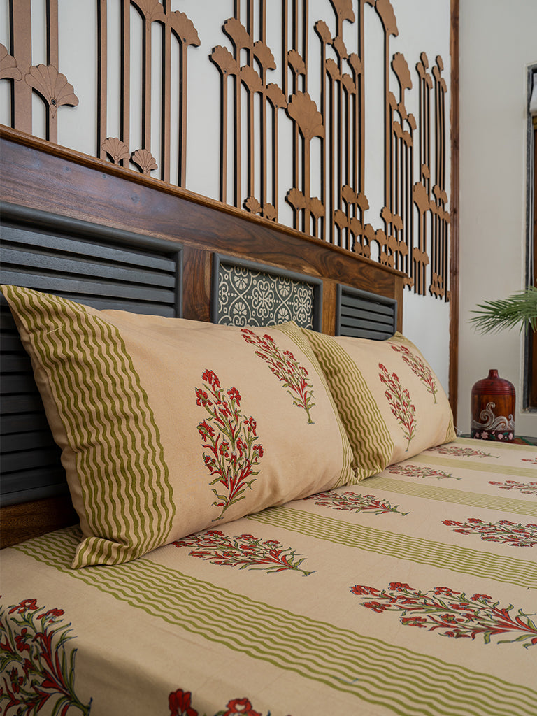 Uplift your room with the soothing yellow block print cotton bedsheet set to enhance your sleep sanctuary. Handmade by our talented artisans with attention to detailing and love for you. This yellow handmade bedsheet comes with the set of pillow covers. Origin of this craft belongs to the Rajasthan region. Cherish the fresh new collection designed this season, filled with utmost compassion.