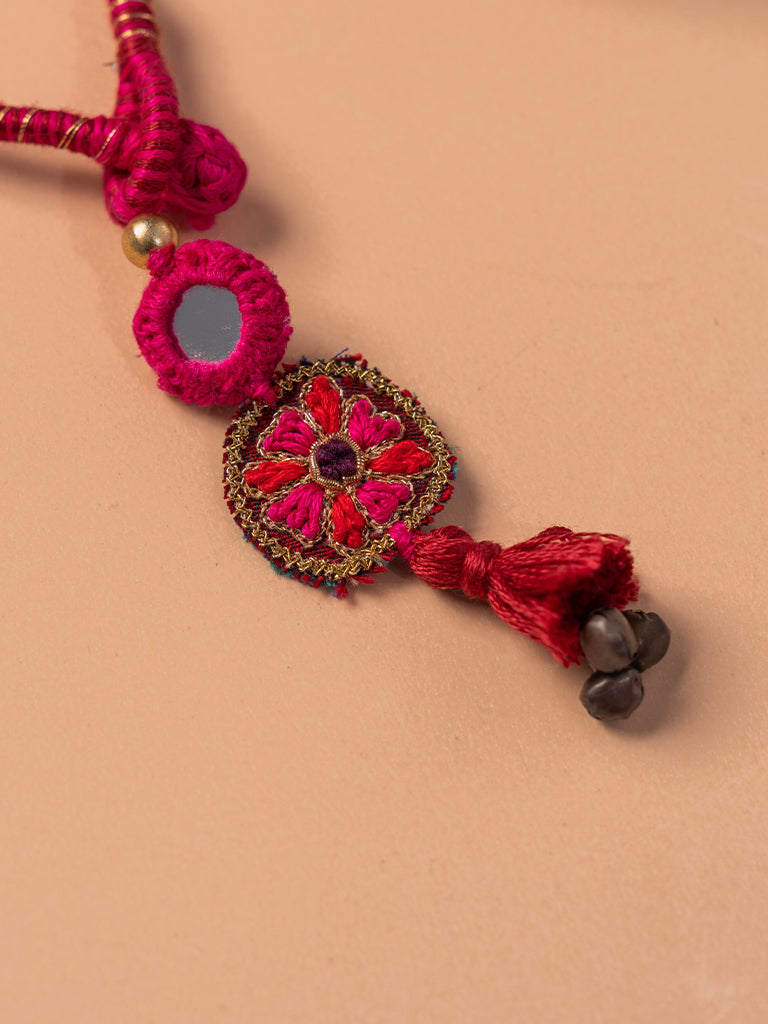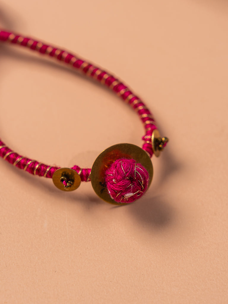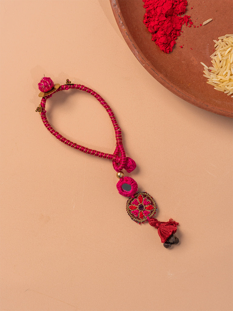 An absolute bond of love and happiness is shared with our zardosi pink bracelet lumba Rakhi. It is designed using superior threads, brass, tikki, ghungroo, and beads. Value the handwork and knatwork done by our artisans to spread more love.